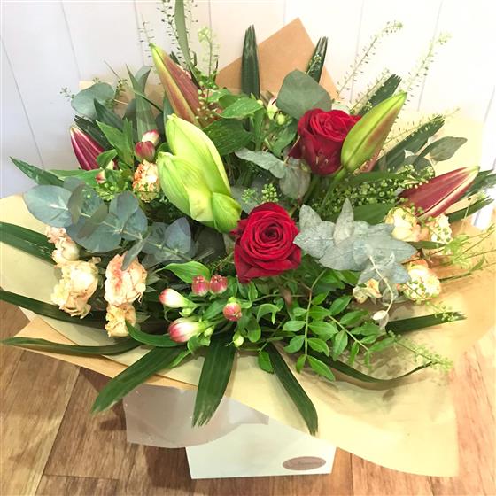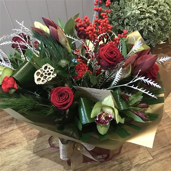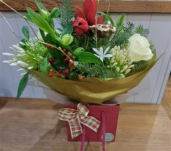 Festive Signature Hand Tied Bouquet gift wrapped and in water.